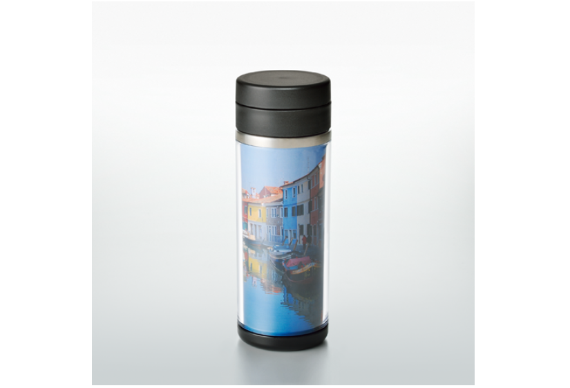 また、従来のカスタムデザインタンブラーでは紙に印刷していました。しかし弊社では耐熱フィルムに裏打ち印刷し、フィルム裏面から透過させているので、光沢仕上げにできます、また白インクや金箔で印刷することで低価格、高精度に印刷が可能で、今までにない圧倒的な存在感を持たせることができます。